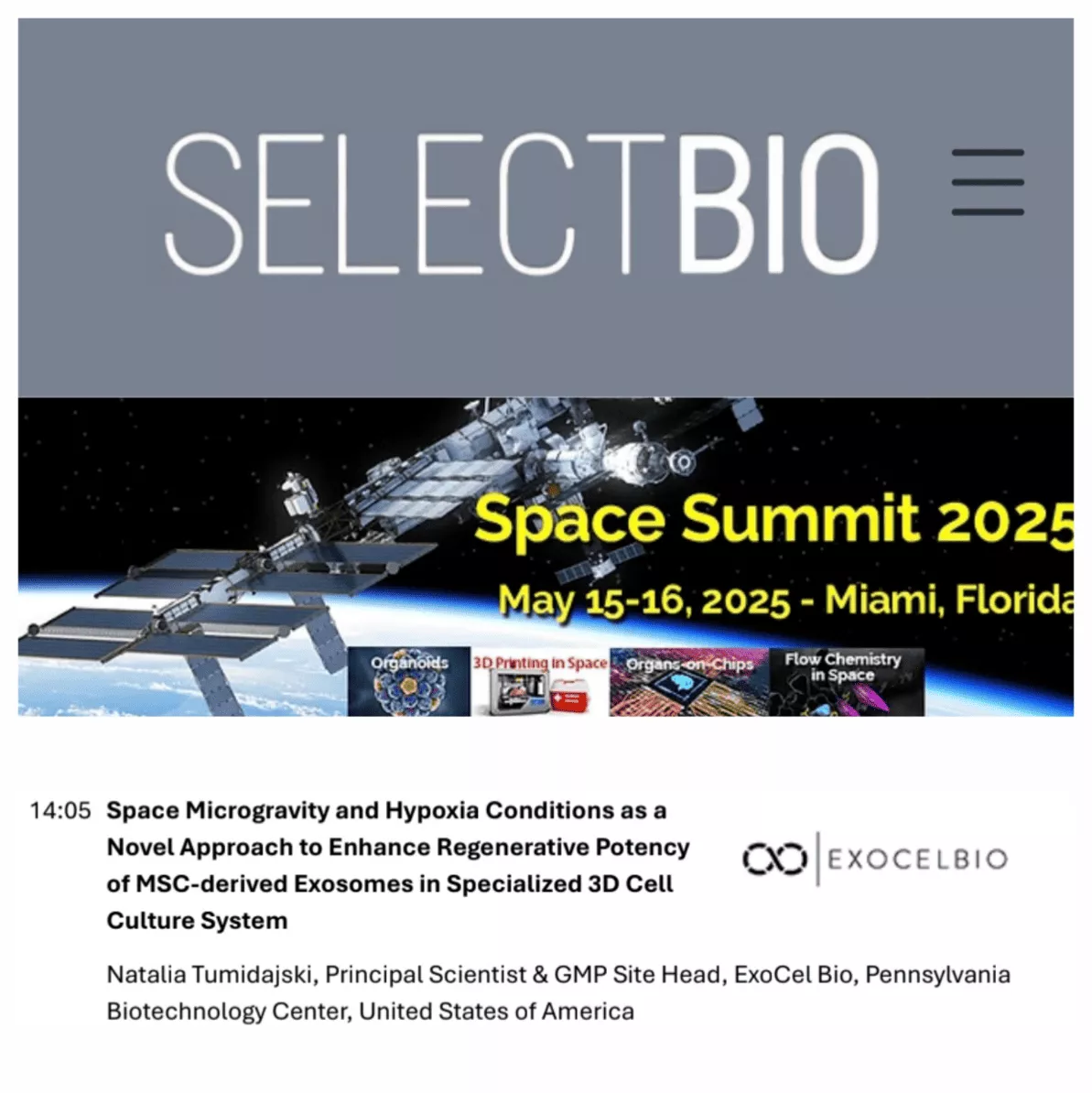Presented at both the Space Summit and Extracellular Vesicles & LNPs tracks, this talk explored how simulated microgravity and hypoxic environments can enhance the regenerative potential of MSC-derived exosomes, with implications for advanced biomanufacturing and regenerative medicine applications.